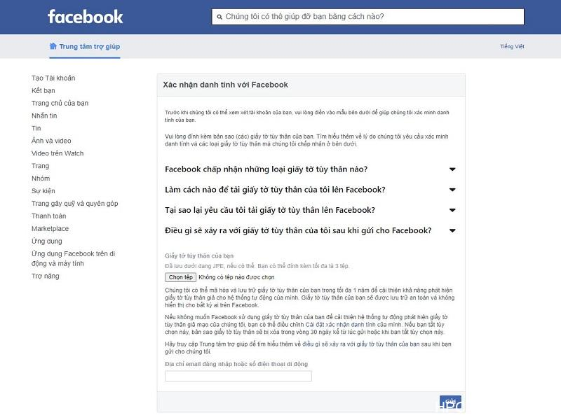 Facebook cho phép sử dụng nhiều loại giấy tờ như CCCD, Hộ chiếu, Bằng lái xe.