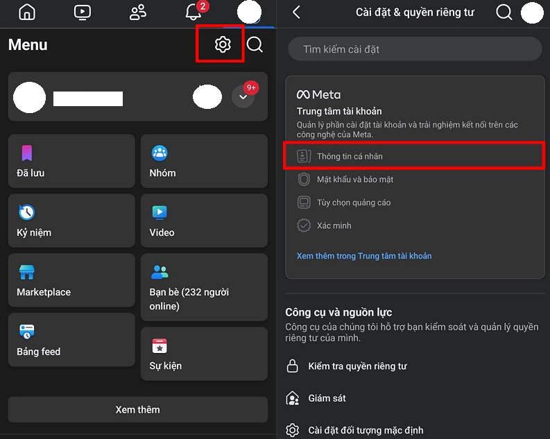Tại giao diện chính của Facebook, chọn biểu tượng ba gạch ngang, sau đó nhấn Cài đặt và quyền riêng tư → Cài đặt.